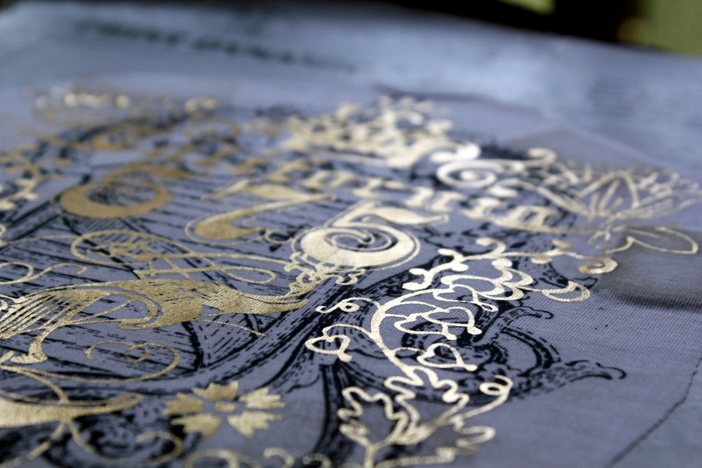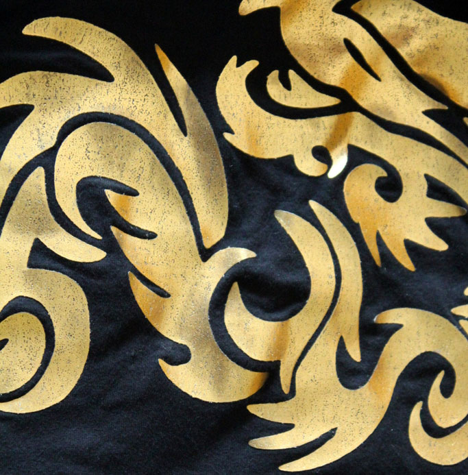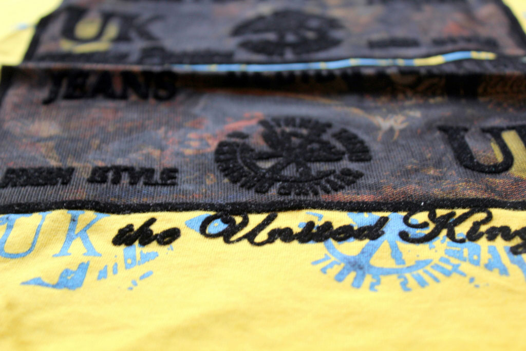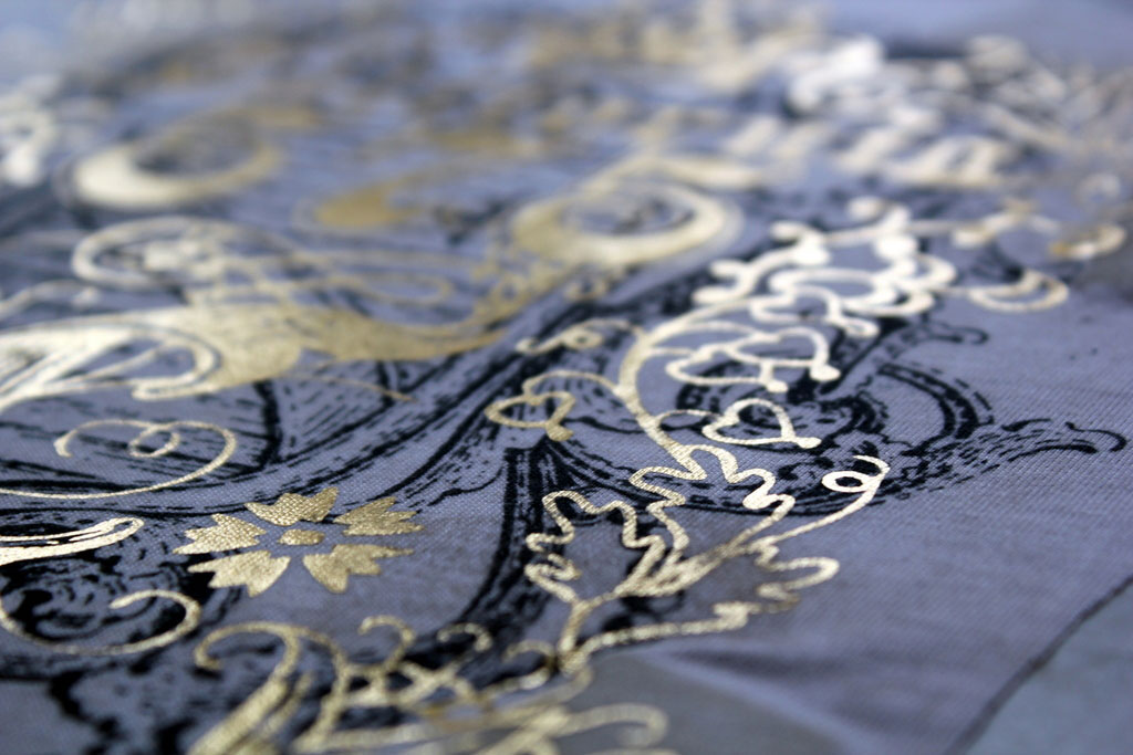 Discharge ink is used to print lighter colours onto dark background fabrics, they work by removing the dye of the garment – this means they leave a much softer texture. The cons with this process is that they are less graphic in nature than Plastisol Inks, and exact colours are difficult to control. One of the pros of using this process is they are especially good for distressed prints and under-basing on dark garments that are to be printed with additional layers of Plastisol. It adds variety to the design or gives it that natural soft feel.